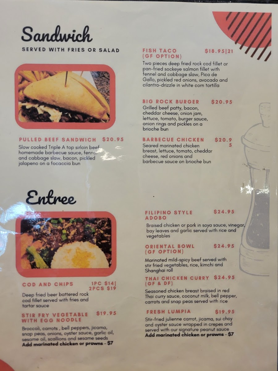 The menu at Big Rock Garage offers a delightful variety of dishes that cater to different tastes, each with a unique twist. For seafood lovers, the Fish and Chips stands out as a classic option, crispy and satisfying. The Lumpia with Prawns offers a great blend of savory and crunchy, while the Spicy Crab brings a flavorful kick that will appeal to those who enjoy a bit of heat in their meal.